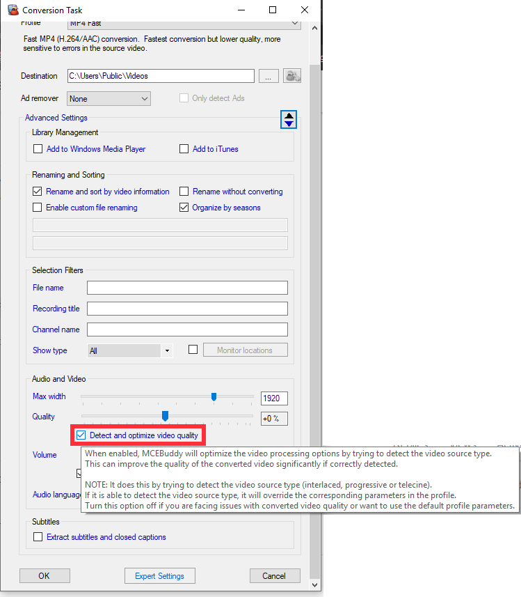 試著在轉換工作設定中調整「偵測並最佳化影片品質」選項,這個選項是專門用來處理交錯式影片的。