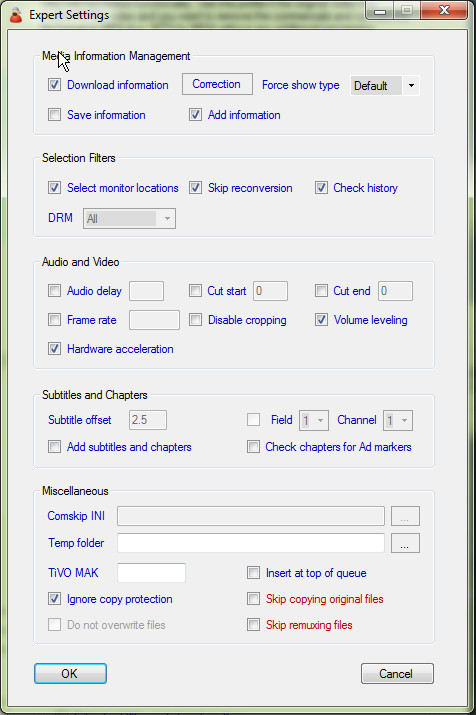 El concepto original era que MCEBuddy recortara 60 segundos del inicio y 2 minutos del final del archivo. Los cortes de inicio y fin se han eliminado (se establecieron en 0 y se desmarcaron) para estas pruebas.