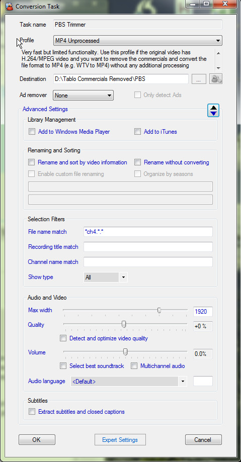 我很欣賞你的熱情,但《美國測試廚房》是 PBS 的節目,裡面完全沒有廣告。因此我對所有 PBS 節目都使用 MP4 Unprocessed 設定檔,並且不啟用廣告移除,以節省轉檔時間。