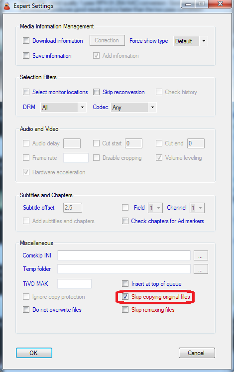 All i want is MCE Buddy to create edl files. I don’t want my source WTV files altered in any way. Is this possible? I setup a task for profile “WTV Unprocessed”, desintation blank, ad remover “Yes (Comskip)”, only detect ads checked. File name match “*.wtv”. However, it seems that it is updating the timestamp of the original file, and it is doing some sort of re-muxing? I am using MCE Buddy 2.4 Beta 8.