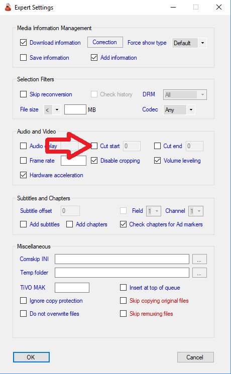 我希望 mcebuddy 在转换时能剪掉所有录制内容的前 50 秒,这样应该足以避免意外,并剪掉大部分上一段节目的内容。