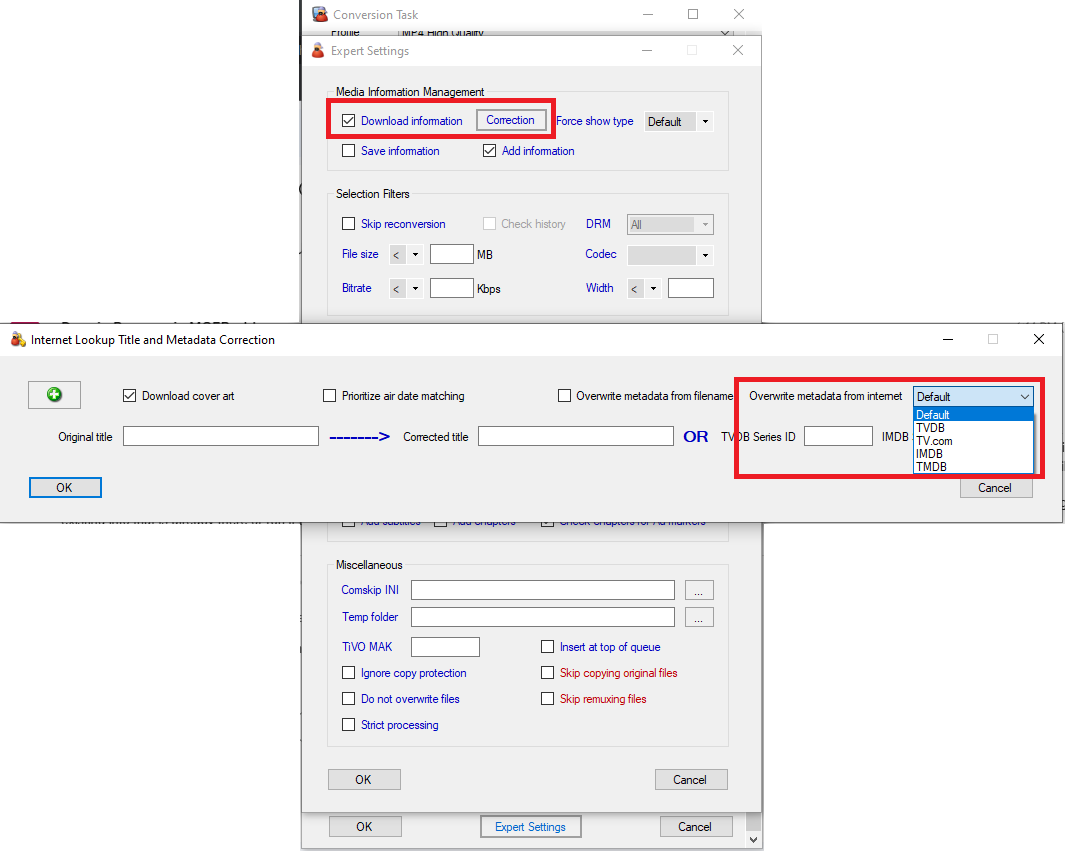 Parece que parte de la información inicial es incorrecta y está confundiendo a MCEBuddy. Si conoces la mejor fuente de información autoritativa para tus programas, en Tarea de conversión → Configuración experta → Descargar información → Corrección puedes elegir la fuente en Sobrescribir metadatos de Internet