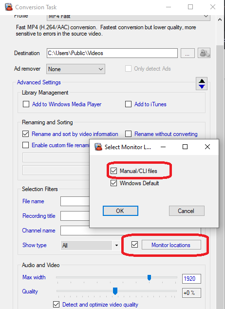 The post-processing script doesn’t want there to be monitored locations, but those are required to restrict a given encoding task. If it’s possible to set up the locations, but never have MCEBuddy check them for new locations, that would work