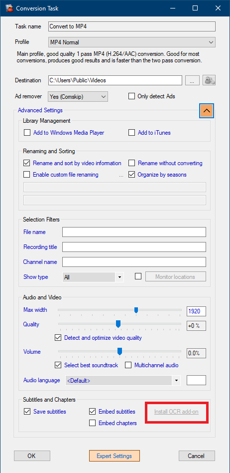 請確保在「轉換任務 - > 進階設定」中啟用了 儲存字幕內嵌字幕 選項,以便使用 OCR 擷取和處理字幕。