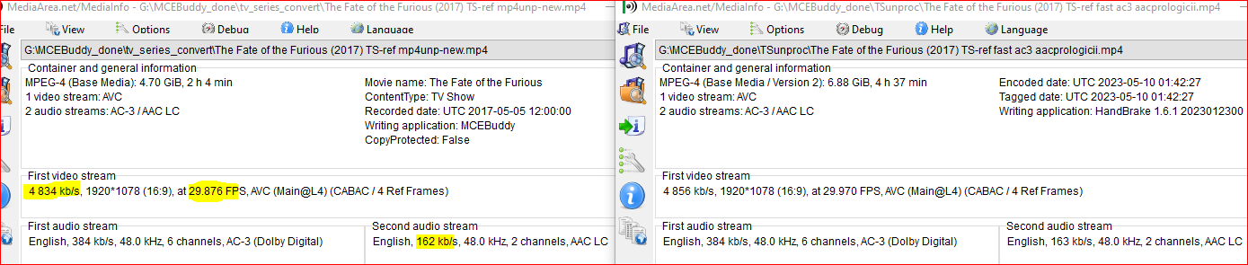 Ah, je vois. J’ai confondu gauche et droite. Oui, l’original a le bon FPS et le « nouveau » fichier par MCEBuddy a le FPS étrange. Ça n’a probablement pas d’importance, puisque les flux se lisent à la vitesse où ils se lisent. Ce n’est pas comme s’il y avait des images de film physiques et que le moniteur d’affichage corrigeait de toute façon.
