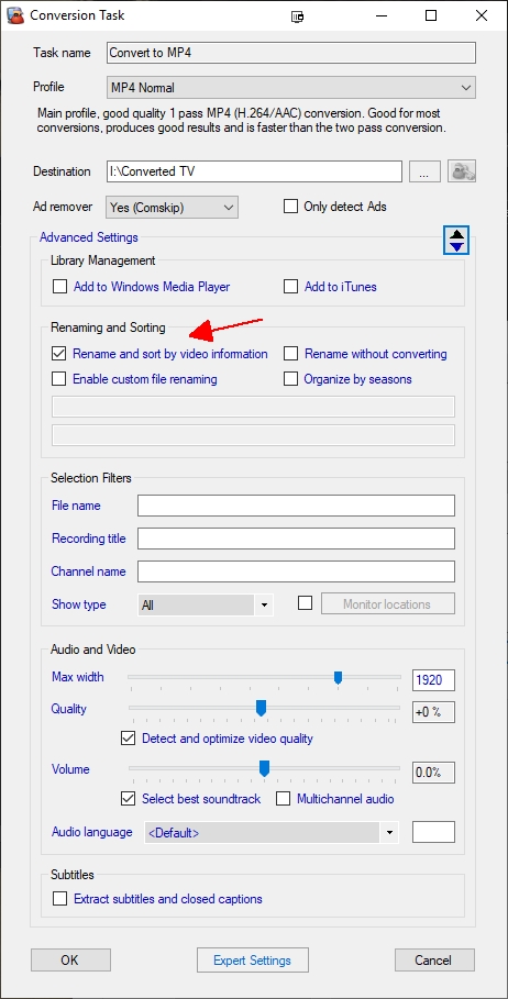 所以,RegEx 部分只是用來在 TVDB 查詢資訊。重點是讓節目資訊能被偵測到,接著 MCEBuddy 就能使用預先填好的變數路徑(當你把滑鼠停在「重新命名並排序…」上時可以看到這是什麼),或者你也可以用下面的選項自己寫一條重新命名規則。