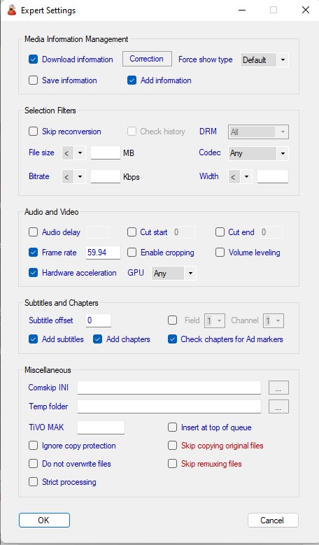 Jeg angiver en billedhastighed på 59,94 under Ekspertindstillinger (jeg har også prøvet 60, ingen forskel).