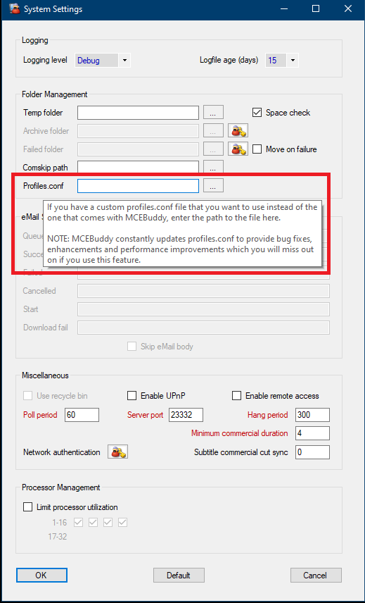 profiles.conf文件放在 MCEBuddy 安装目录之外的某个目录(例如C:\\MCECustomProfile),然后在 MCEBuddy 中通过 设置 → 专家设置 → Profiles.conf → 点击 … 选择该自定义profiles.conf。任何对安装目录下默认