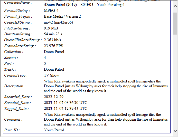 2023-11-07T08:03:25 MCEBuddy.MetaData.VideoMetaData --> Extracting metadata from file -> \\NAS\Video\Temp\MCEBuddy\In\Orig-MKV-Stream_Default\1\Doom Patrol (2019) - S04E05 - Youth Patrol.mp4