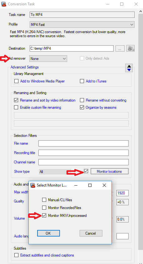 Paso 2: Configura una Tarea de Conversión que convierta tu archivo TS a archivos MKV Sin Procesar. Establece el destino como c:\\temp\\MKVUnprocessed. Querrás eliminar los comerciales en esta (así que configúrala con Comskip o lo que uses). También no olvides seleccionar la casilla Monitor locations y seleccionar la Ubicación de Monitoreo que creaste en el Paso 1: