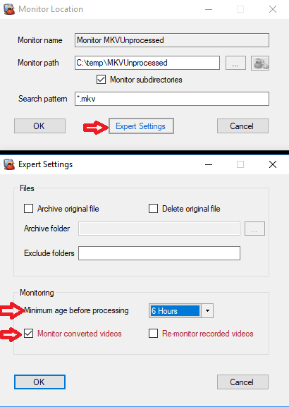 Schritt 3: Erstelle einen zweiten Monitor-Ordner, der den Ausgabeordner des ersten Tasks (c:\temp\MKVUnprocessed) beobachte. Öffne die Expert Settings und lege eine Zeitverzögerung fest (Minimum age before processing), z. B. 6 oder 12 Stunden. Aktiviere zwingend Monitor converted videos, damit MCEBuddy die bereits konvertierten Dateien erneut verarbeitet (Standardverhalten ist anders):