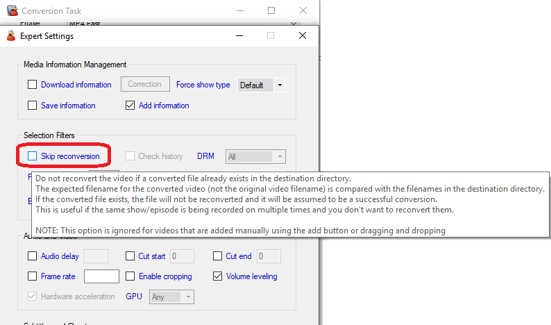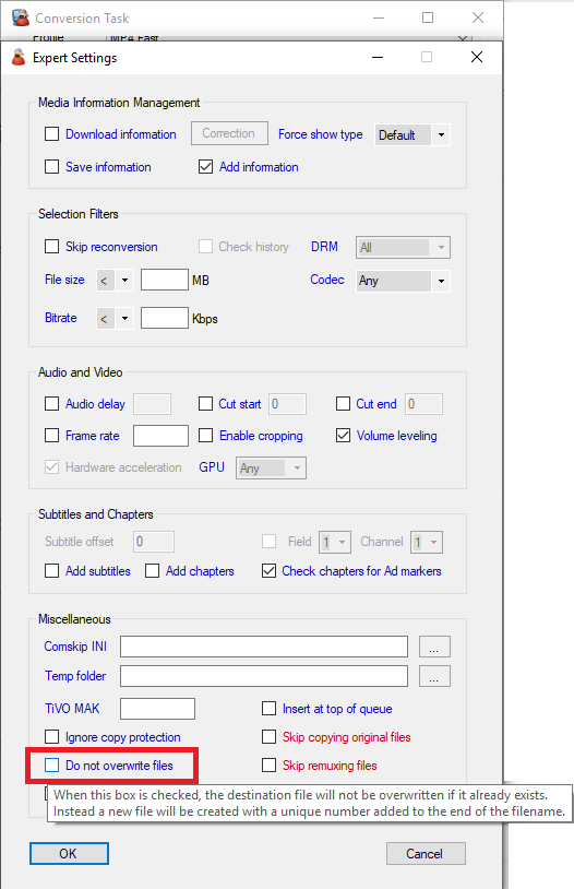 由于文件名不同,它们会被视为独立的转换任务。不过,如果你在专家设置中启用了“跳过转换”选项以检查目标文件名,那么只有在该情况下,mcebuddy 才会检查转换后文件的预期目标名称;如果该文件已存在,就会跳过转换。