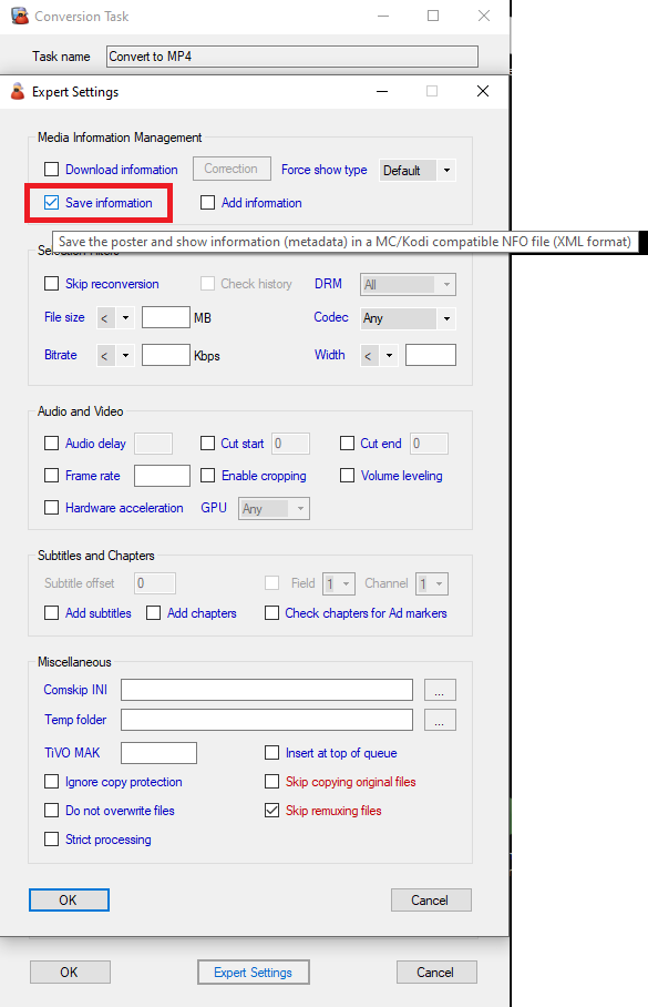 Hopend op wat hulp. Ik stap eindelijk over van WMC en onderzoek Kodi + NextPVR als vervanger. Ik heb een zeer grote verzameling .wtv-opnames (tv-programma’s) en ontdekte dat Kodi ze weliswaar afspeelt, maar de in de bestanden ingebedde tags niet lijst te lezen—geen programmatitel, beschrijving, enzovoort. Naar mijn weting probeert Kodi ofwel on line informatie op te halen, ofwel lokale .nfo-bestanden te vinden die bij de opnames horen. De online optie werkte niet, dus zoek ik nu een programma dat de metadata in de .wtv-bestanden uitleest en de .nfo’s aanmaakt. Volgens de beschrijving zou MCEBuddy dat moeten kunnen, maar tot nu toe krijg ik het niet aan de praat.