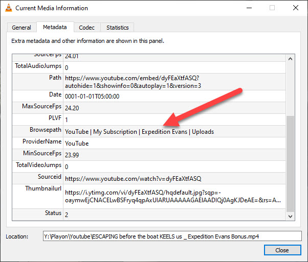 Er staat een veld browsepath met de waarde — “YouTube | My Subscription | Expedition Evans | Uploads”