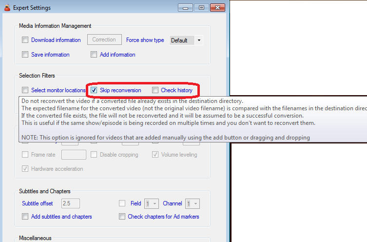 Was du beachten musst: Liegt die Originaldatei unter einem anderen Dateinamen vor? Falls ja, behandelt MCEBuddy sie als neue Datei, selbst wenn die Zieldatei nach der Konvertierung mit einer bereits vorhandenen Datei identisch ist. Um dies zu vermeiden (da Sendungen oft zu verschiedenen Zeiten wiederholt und neu aufgenommen werden), kannst du in der Konvertierungsaufgabe unter „Experteneinstellungen“ die Option „Neukonvertierung überspringen“ aktivieren und optional „Verlauf prüfen“. Siehe die Popup-Hilfe für Beschreibungen.
