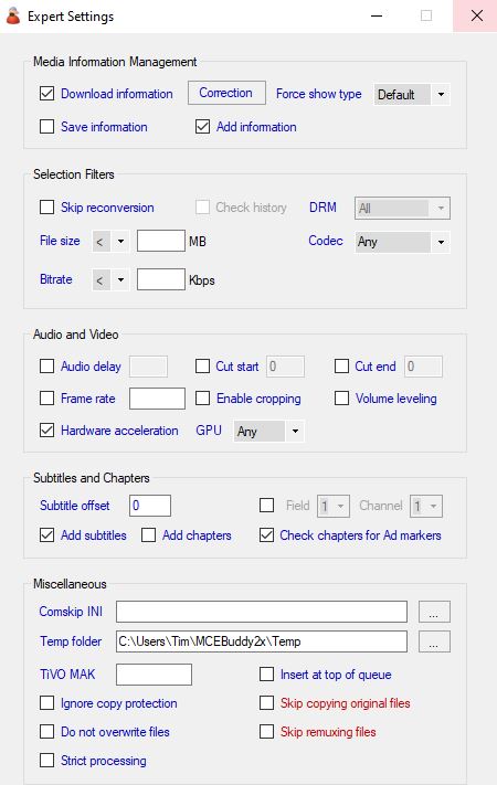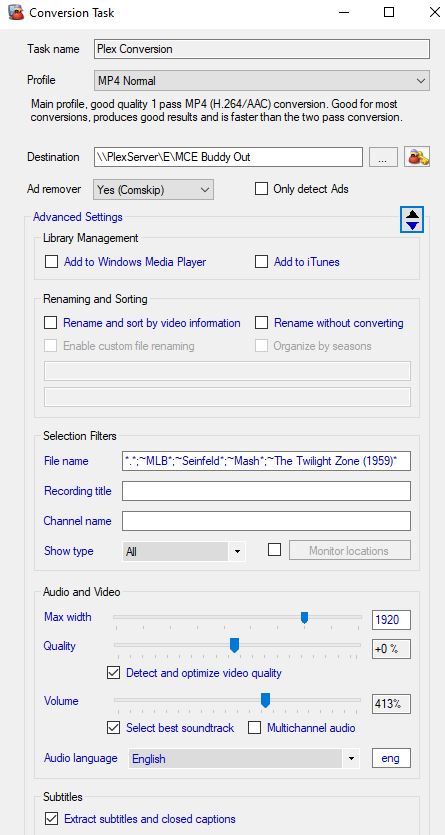 個人覺得 MCE 去廣告的效果比 Plex 好,而且能把 .ts 轉成 MP4 或其他格式,我通常就讓 MCE 全權處理。轉檔工作我設了四組不同設定。我喜歡保留字幕選項,電影和部分影集會留字幕;但像棒球轉播或《歡樂單身派對》重播就不需要。《陰陽魔界》老片畫質較差,有些我就維持 .ts 不轉。畫質方面,大多數時間我用 MP4 Normal,MP4 High Quality 實在太慢。