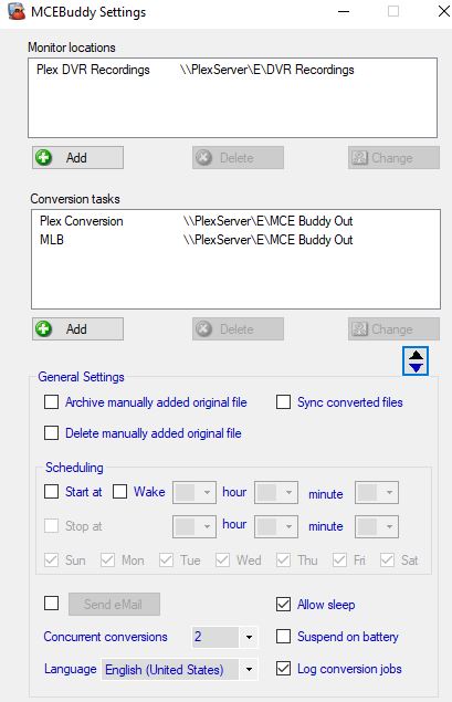 以下設定是我用來處理電影與日常影集、並希望它們帶字幕的。目前這些工作都跑在我剛買的新桌機上,這台機器「武裝到牙齒」:i7 處理器、16 GB RAM、SSD。我把磁碟機對應到 \\PlexServer\E:,所以所有影片在轉檔後會先集中到這裡,之後再搬到 WD 伺服器(那邊才放真正的電影、影集、音樂)。這裡看到的所有設定,都是從我的 Plex Server 直接複製過來的,我只是想看看這台新電腦能扛多少。